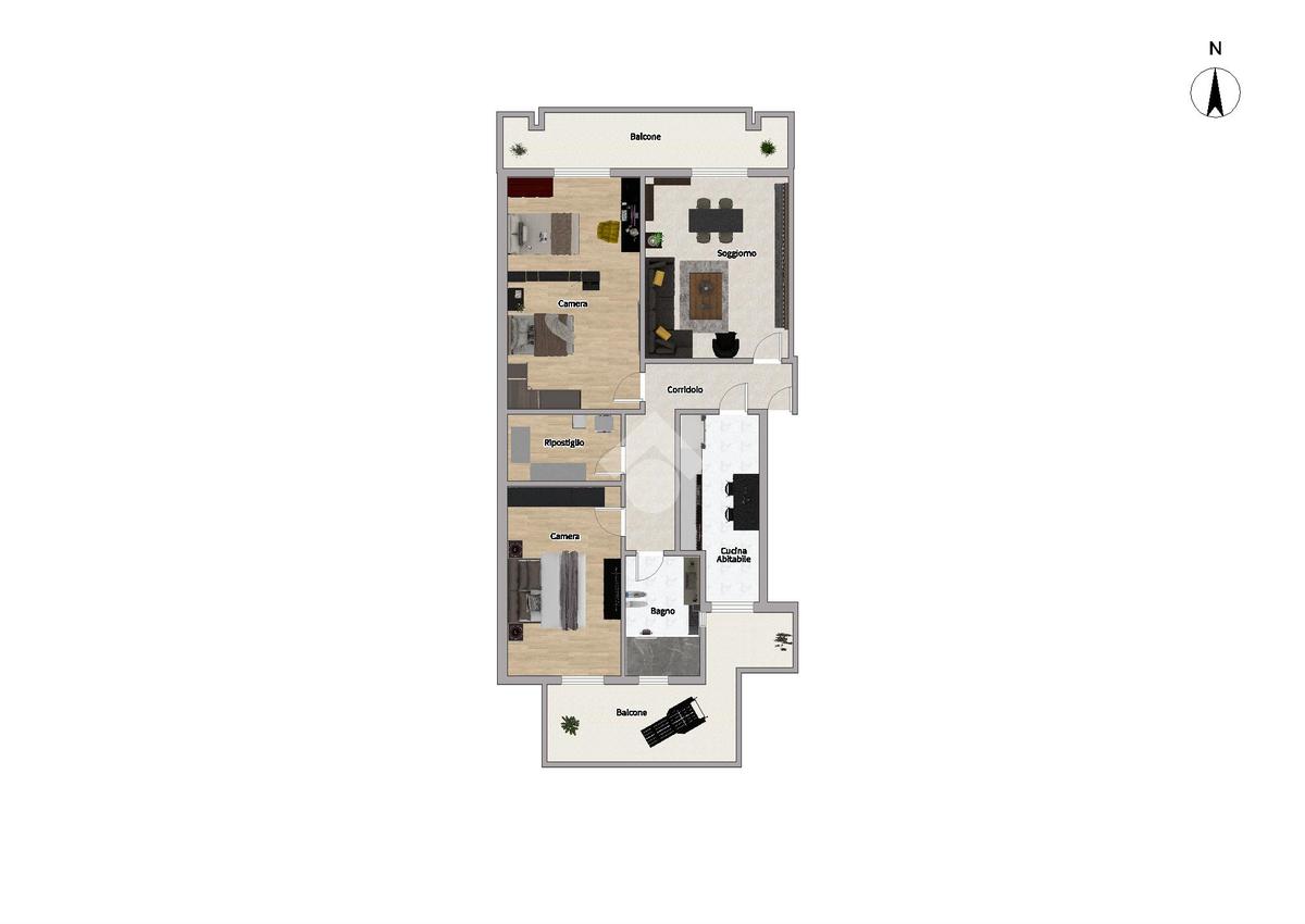L’ingresso si apre su un comodo soggiorno con affaccio esterno su un grande balcone, mentre la cucina abitabile si sviluppa verso il balcone interno, dove è presente un pratico angolo lavanderia.